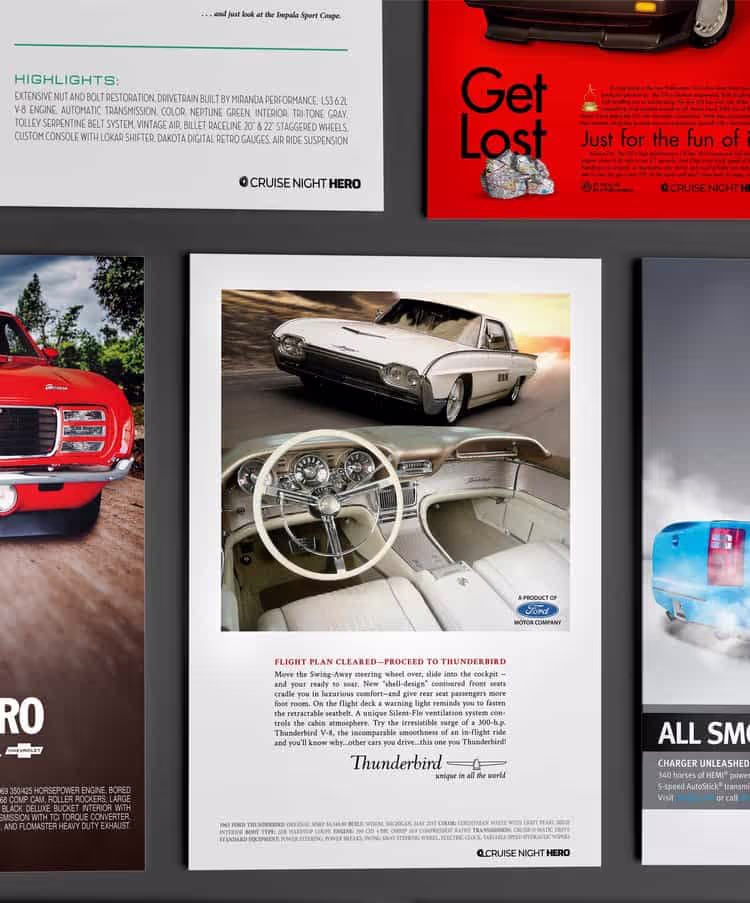 Vintage auto ads are the perfect starting point for your custom show board and spec board because they give the original feeling of the car in a way the manufacturer meant the car to be seen. Order now or book a call to get the wheels rolling, we’ll talk and I’ll listen, then we’ll create something worthy of all the time you spent making the car yours. Your car, your story, your poster.