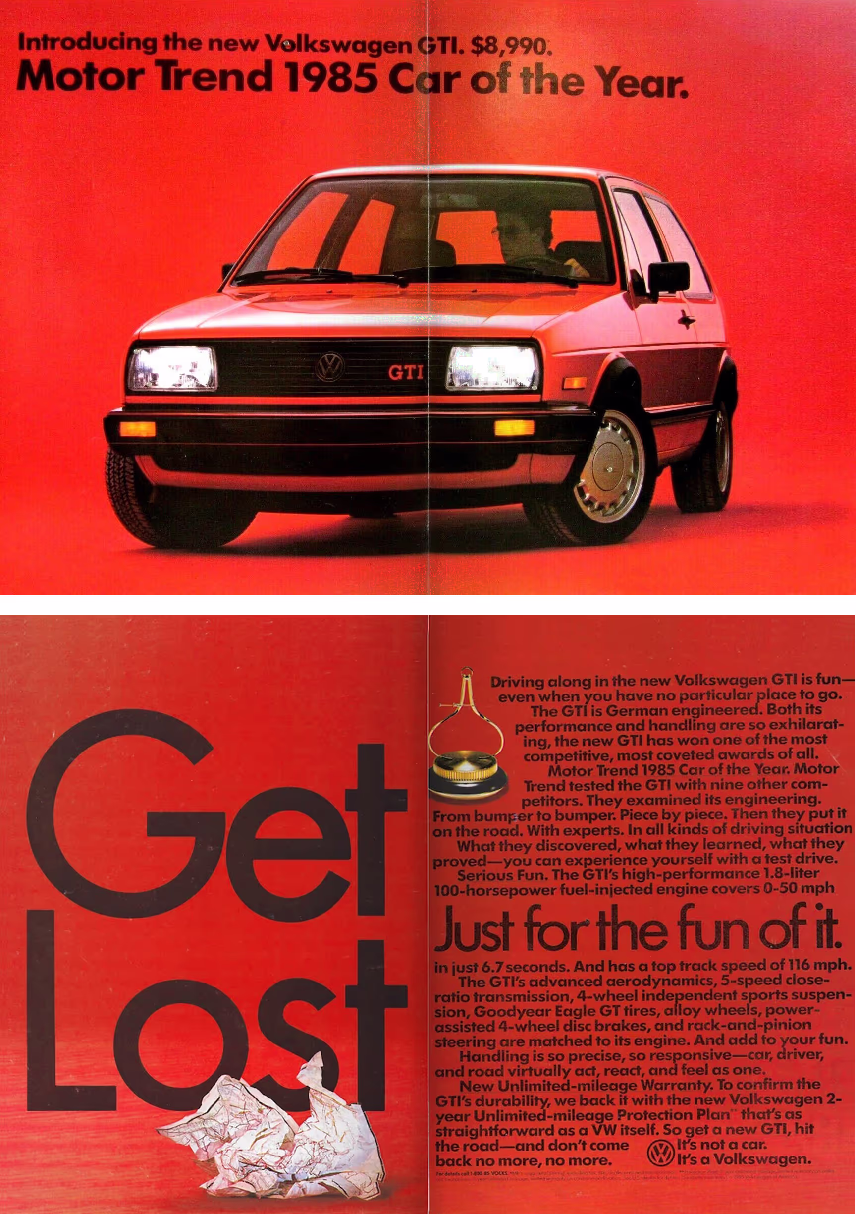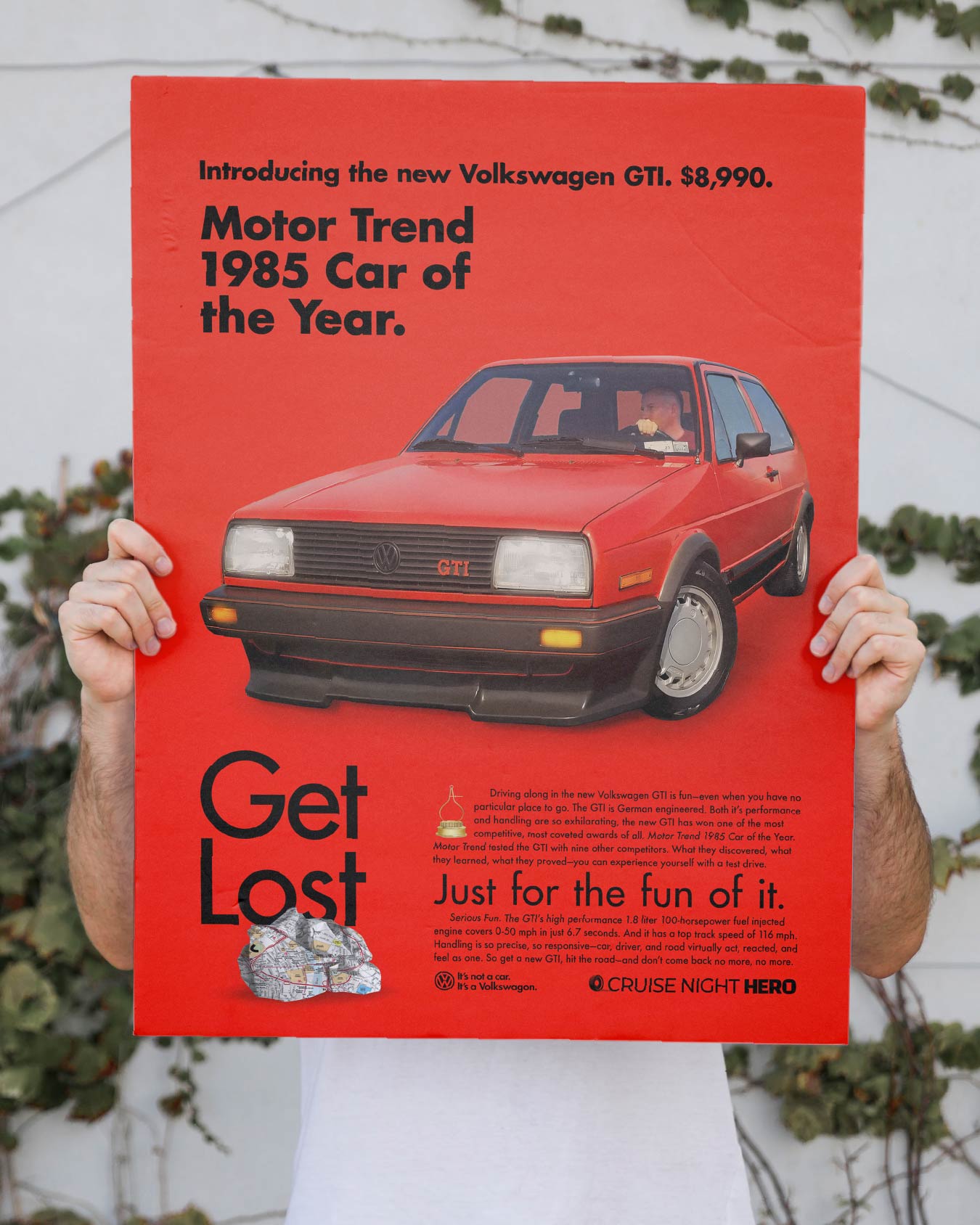The poster that started it all! My 1985 Volkswagen GTI, with details from me driving my car, down to the local map crumpled up. It all started with the inspiration ad, a sweet 4 page spread from Road & Track introducing the car back in 1985. Then out to an empty parking lot for the photo of me driving, taken on an iPhone X. Once I got the right photo, it was on to photo editing, the photo editing cut-out, color correction, and harmonizing with details down to windows, reflections, and shadows. Then I put the custom show board together writing the cars story and making sure all specs are represented.